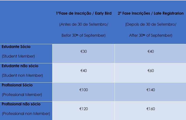 - Os pagamentos realizados por transferência bancária (IBAN PT50 0033 0000 0004 5908 0708 4) devem incluir o descritivo com a identificação respectiva (nome do congressista e do evento). O comprovativo de pagamento deve ser enviado para o e-mail (Este endereço de email está protegido contra piratas. Necessita ativar o JavaScript para o visualizar.).